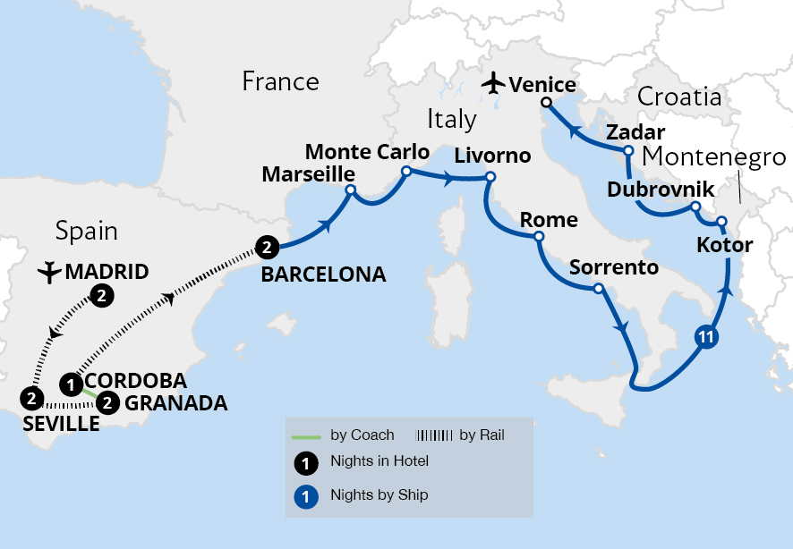 Be captivated by the wonders of Spain, Italy, Montenegro and Croatia on a remarkable holiday across land and sea. Led by an experienced Great Rail Journeys Tour Manager, discover Spain's iconic cities and sights, including Madrid's grand boulevards, Granada's striking Alhambra and Seville's magnificent Plaza de España on an escorted tour. ...