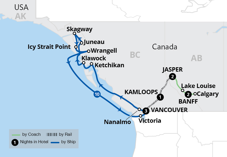 Experience the breathtaking beauty of Canada and Alaska on an unforgettable journey by land and sea. From the picturesque town of Banff, admire the beauty of Lake Louise and view the Athabasca Glacier before boarding the iconic Rocky Mountaineer, taking in breathtaking scenery on one of the world's most scenic railways as we journey to Vancouver.
