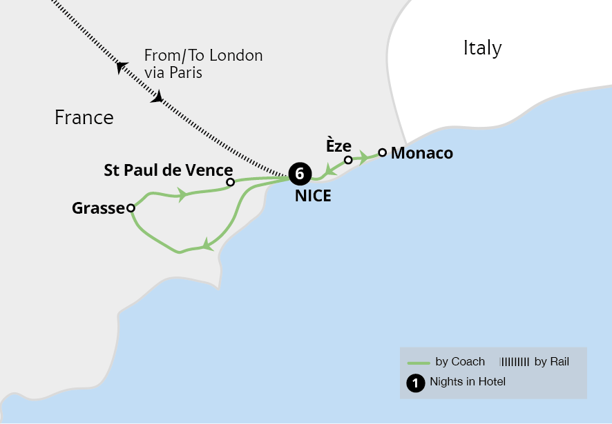 Your wonderful tour of the French Riviera begins at London St Pancras, where we meet the Tour Manager this morning. We board the Eurostar to Paris, enjoying a light meal on the way. In the French capital, we change trains for a journey in First Class to Nice, arriving in the French Riviera this the evening.