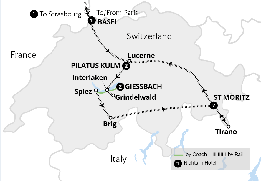 Your spectacular winter adventure begins as you meet the Tour Manager and your fellow travellers at London St Pancras, ready to board in Eurostar Plus. We enjoy a light meal at our seats before arriving in the French capital, where we board the train to Basel - the quickest route to Switzerland.